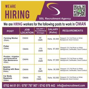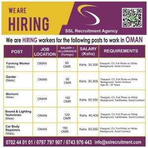 #OmanJobs #SSLRecruitment #GulfJobs #WorkInOman #MechanicJobs #FarmingJobs #GardenerJobs #CarRepairJobs #JobsAbroad #OmanOpportunities #OverseasJobs #SecureYourFuture #ApplyNow #WorkAbroad2025