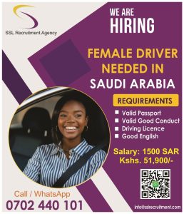 Female Drivers Wanted in Saudi Arabia! Earn 1500 SAR (Ksh. 51,900) monthly Requirements: Valid Passport, Good Conduct, Driving Licence & Good English. Apply now! Call/WhatsApp: 0702 440 101 / 0743...