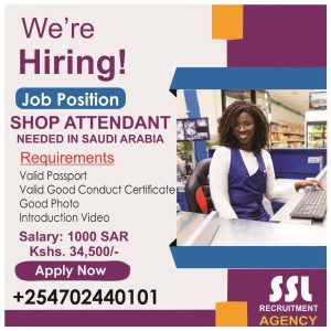 β¨ Secure Your Future Abroad! β¨Weβre hiring Shop Attendants in Saudi Arabia πΈπ¦π° Salary: 1000 SAR (Kshs. 34,500/-) π Requirements:β Valid Passportβ Good Conduct Certificateβ Good...