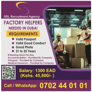 βοΈ Pack your bags β Dubai is calling! π¦Factory Helpers Needed β Earn 1300 AED (Kshs. 45,800/-) π°β FREE Accommodationβ FREE Transportβ FREE Medical Insurance π Call/WhatsApp: 070...