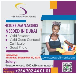 β¨ Work Opportunity in Dubai! β¨SSL Recruitment is looking for House Managers π¦πͺβ Salary: 1000 AED (Kshs. 35,300)β Interviews: Thursday, Sept 11, 2025β Requirements: Valid Passport, Good...