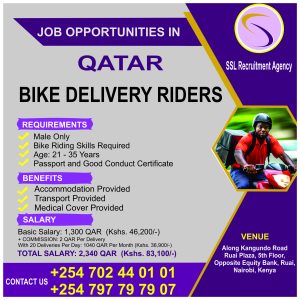 SSL Recruitment Agency is recruiting Delivery Riders to work in Qatar with reputable delivery company. 💰 Salary Package:✅ Basic Salary: 1300 QAR (Kshs. 45,500)✅ + Commission: 2 QAR per delivery...