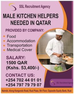 We are recruiting MALE KITCHEN HELPERS to work in QATAR. REQUIREMENTS• Valid Passport• Basic English Communication• Age: 21 – 35 years BENEFITS• Salary: Kshs. 53,400/- per month• 8 Hours o...